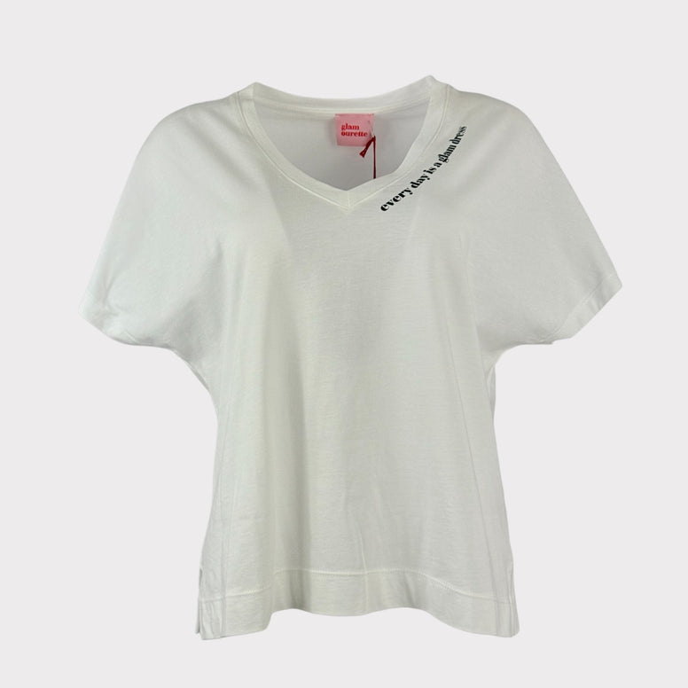 Maglia di Cotone morbido, con scollo a V, vestibilità ampia ma garbata, lunghezza stardand, manica corta e spalla scesa. Scritta stampata in corsico ion nero "every day is a glam day", su un lato dello scollo. Taglia Unica. Veste bene fino ad una taglia 44 IT. Banda sul fondo e spacchi laterali. L'effetto over richiesto dal modello si ottiene su una taglia 40 e 42 IT.